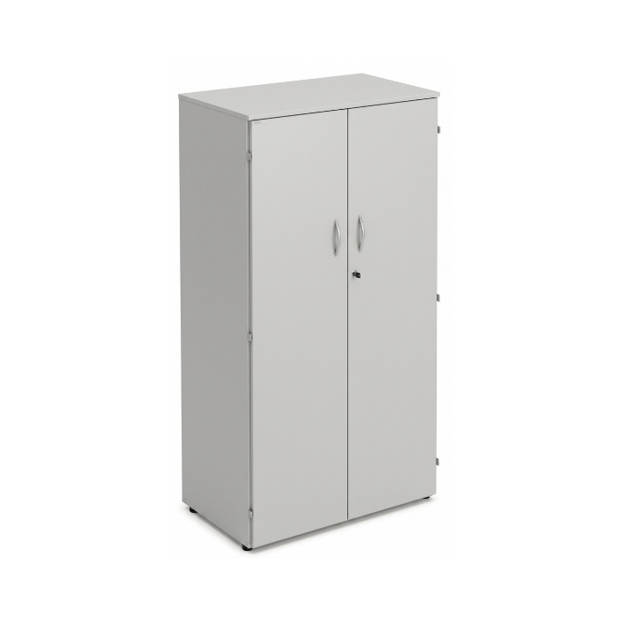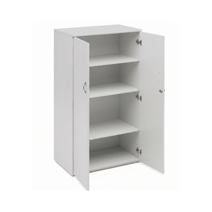 Descrição: Armário alto, com 3 prateleiras, duas portas, base, prateleiras e fundo de 18 mm e tampo superior de 25mm, com fita PS de 2mm revestidos em BP dupla face, rodapé metálico com niveladores. Dispositivo de pasta suspensa opcional.