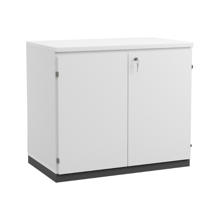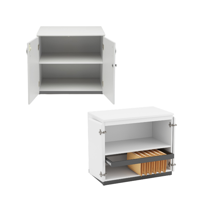 Descrição: Armário baixo com duas portas, puxador cava e tranca com chave . Tampo superior em MDP 25mm laminado; corpo, prateleira interna e portas em MDP 18mm laminado. Base em aço. Dispositivo para pasta suspensa opcional.