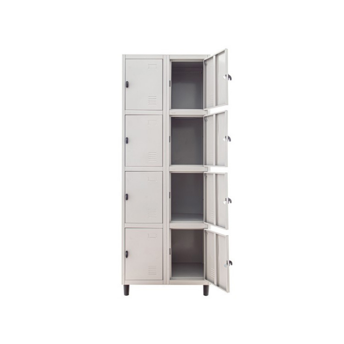 Descrição: Roupeiro em chapa de aço com pintura eletrostática epóxi. Possui 8 portas pequenas com nichos medindo 37cm x 2cm x 37cm e capacidade de 10kg por bandeja. Pés com sapatas plásticas protetoras e pistão para cadeado.