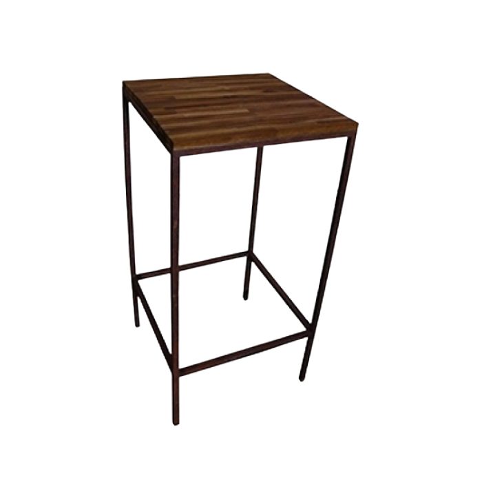 Descrição: Banqueta quadrada com estrutura em metal oxidado e assento em madeira teca.