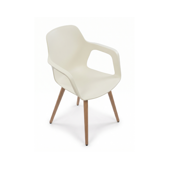 Descrição: Cadeira em polipropileno com pés em madeira tipo palito e braço vazado.