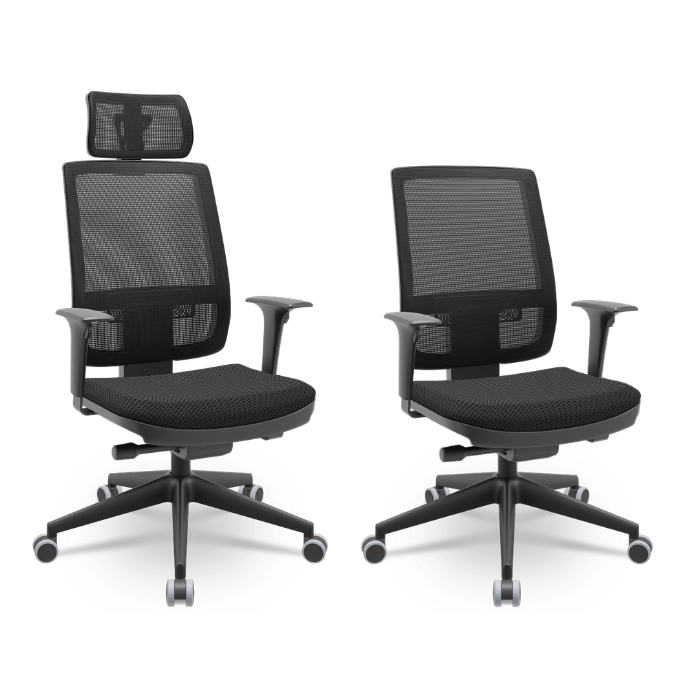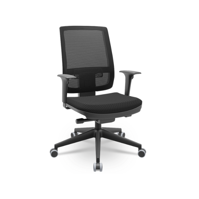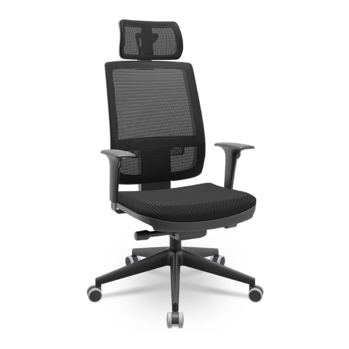Descrição: Cadeira giratória, espaldar alto, assento estofado, encosto em tela. Possui apoio lombar, regulagem de altura para assento, encosto e braços, sistema backsystem para inclinação. Base Itália, rodízios em PU.
