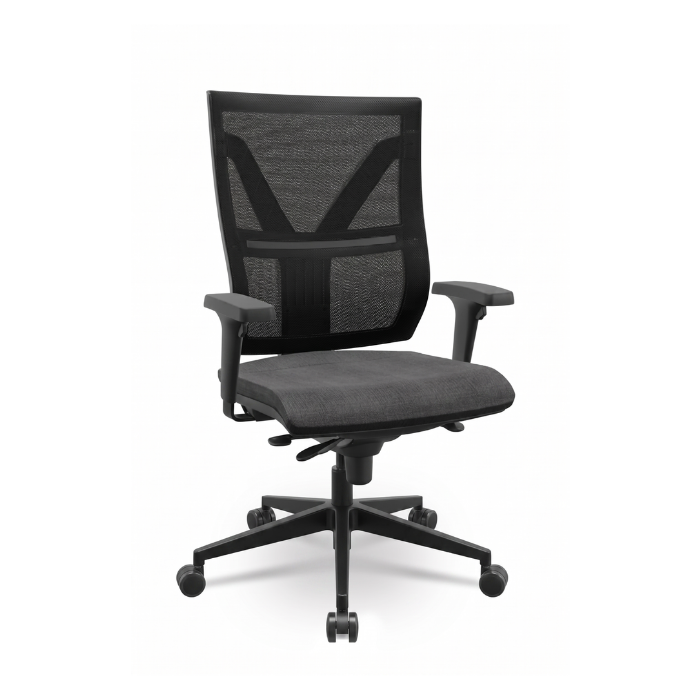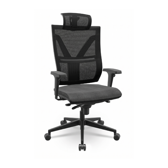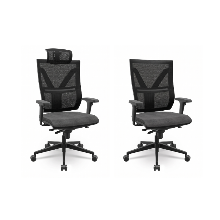 Descrição: Cadeira giratória, espaldar alto, assento estofado, encosto em tela. Possui apoio lombar, regulagem de altura para assento, encosto e braços, sistema backsystem para inclinação. Base cromada, rodízios em PU.