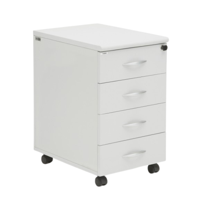 Descrição: Gaveteiro volante (rodízios) com 4 gavetas compartilhadas, tampo superior em MDP 25mm liso e laminado; corpo e frente de gavetas em MDP 18mm liso e laminado, com fechamento em chave e puxador lateral.