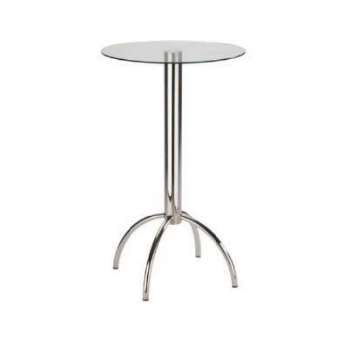 Descrição: Mesa alta bistrô com base cromada e tampo de vidro incolor.