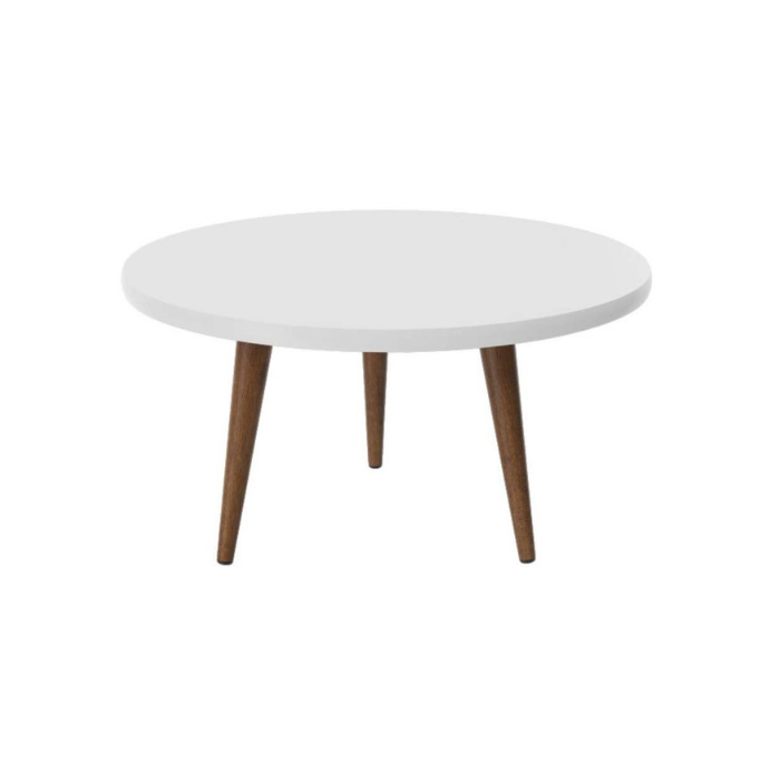 Descrição: Mesa de centro com tampo branco e pés tipo palito em madeira.
