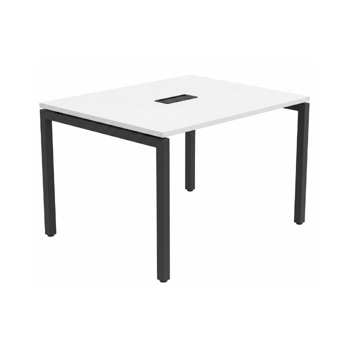 Descrição: Mesa de reunião retangular, tampo em laminado liso MDP com 25mm. de espessura, estrutura com pés tipo trave em aço tubo 50x50mm., possui sapatas niveladoras, caixa de conectividade com tampa basculante, sapatas niveladoras.