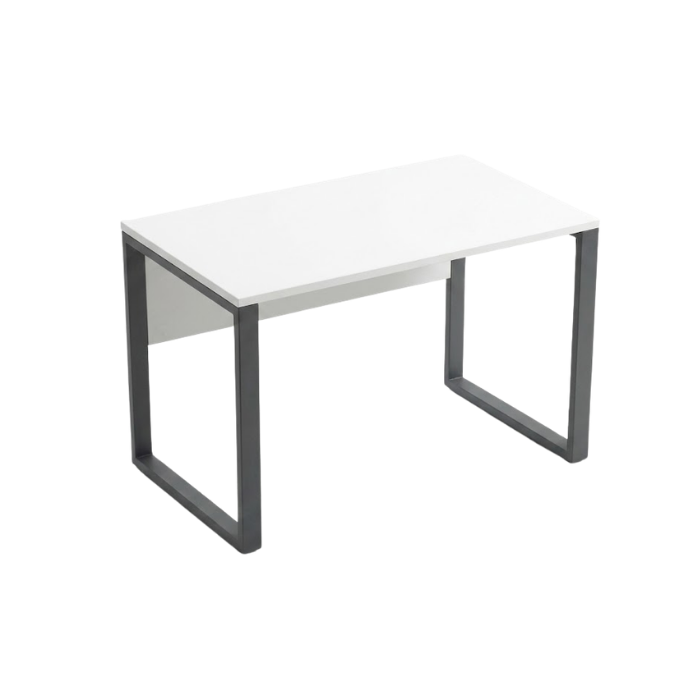 Descrição: Mesa retangular com tampo em laminado MDP 25mm, borda reta, painel de travamento em laminado MDP 18mm, pés tipo quadro em aço tubo 50x30mm com sapatas niveladoras.