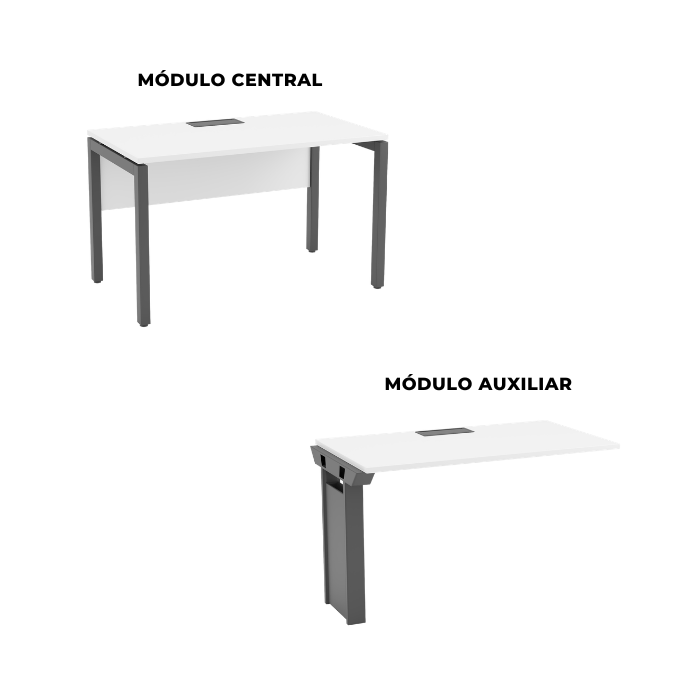 Descrição: Mesa plataforma simples com tampo em MDP 25mm laminado e borda reta. Módulo Central com pés trave em tubo de aço 50x50mm. Módulo Auxiliar com pé intermediário tipo shaft em aço, que permite a passagem de cabos, com tampa de saque frontal. Possui calha sob o tampo e caixa de conectividade com tampa basculante.