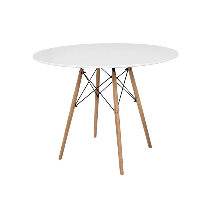 Descrição: Mesa redonda de madeira com tampo em MDF com espessura de 18 mm e pernas em madeira e metal treliçado.