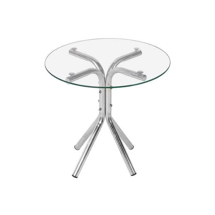 Descrição: Mesa redonda com estrutura em tubos de aço cromado, tampo composto de vidro cristal.