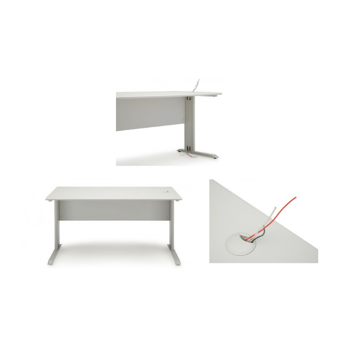 Descrição: Mesa com tampo em MDP, com espessura de 25mm, revestido em laminado dupla face, com fita de borda de 2mm, passagem para fiação de 60mm com acabamento em passa fio; pés em aço de carbono com calhas sacável para passagem de fiação e sapata niveladora.