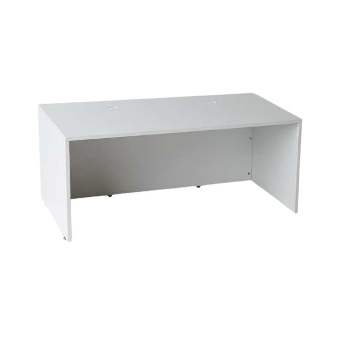 Descrição: Mesa retangular, tampo laminado MDP, painel frontal em laminado MDP. Possui sapatas niveladoras e calha sob o tampo.