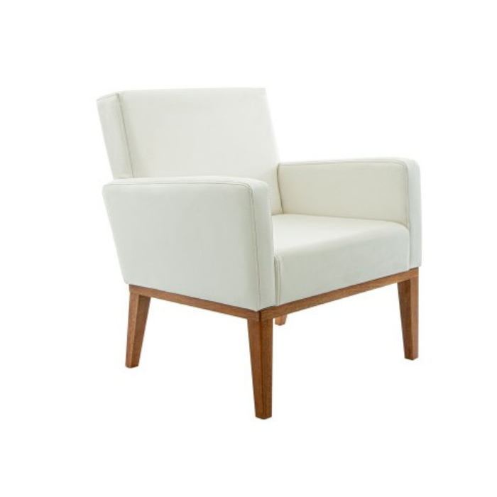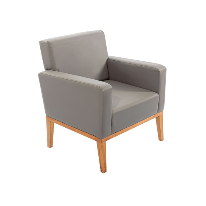 Descrição: Poltrona com estrutura em madeira maciça (Eucalipto), percintas elásticas emborrachadas, revestido com tecido em couro sintético.