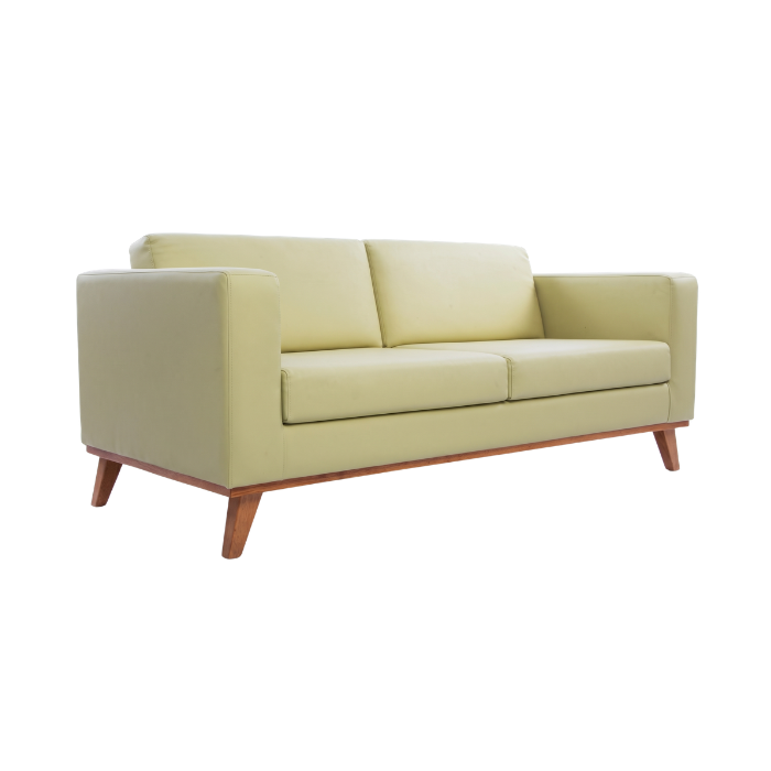 Descrição: Sofá em couro com 2 lugares. Estrutura em madeira maciça (Eucalipto) revestida com espuma (D30/assentos e D26/espaldar) e tecido em couro sintético. Percintas elásticas emborrachadas.